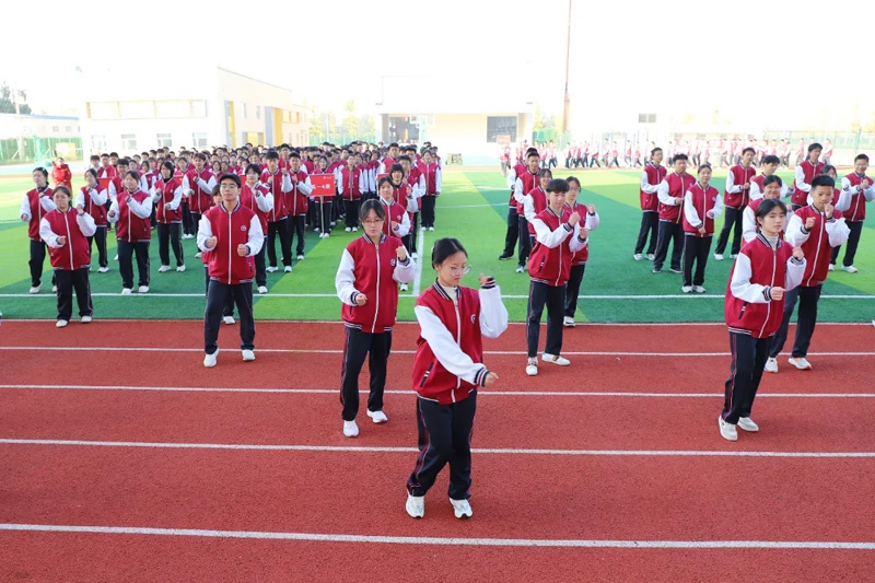 紧接着,全体同学在绿茵场上整齐列队,齐做广播体操,每一个动作都标准有力,整齐划一,阳光洒在同学们青春洋溢的脸庞上,映照出他们对运动的热爱与期待。