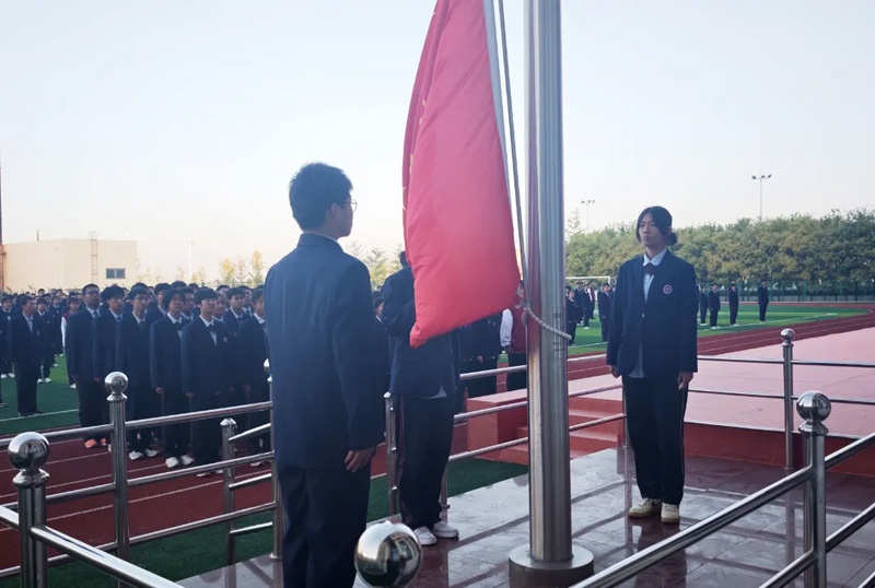 随着雄壮的国歌声响起,五星红旗在晨曦中缓缓升起。全体师生凝视着这面由先烈热血浸染的旗帜,齐声高唱国歌,校园内回荡着对祖国深情的祝福。