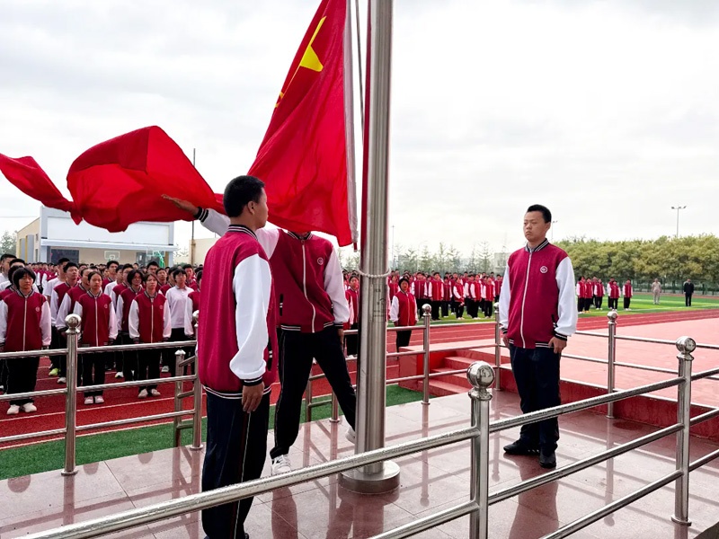 国旗护卫队步伐铿锵有力,护卫着鲜艳的五星红旗走向升旗台。伴随着雄壮激昂的国歌,五星红旗冉冉升起,迎风飘扬。全体师生整齐肃立,向国旗行庄严注目礼,高声齐唱国歌,铿锵歌声中饱含着对祖国深切的热爱与崇高的敬意。