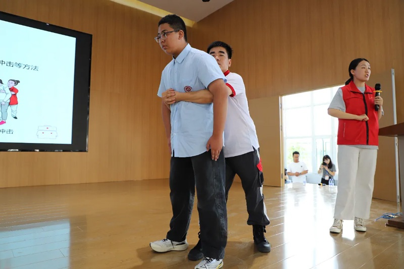 正定县人民医院王露老师通过通俗易懂的语言和规范清晰的现场演示,向同学们系统讲解了海姆立克急救法的适用情境与操作要领。她强调,在发生气道异物梗阻导致窒息的危急时刻,正确运用海姆立克法能够迅速有效地排出异物,为生命争取宝贵时间。同学们认真聆听、踊跃参与,在模拟操作中加深了对急救步骤的理解,也体会到出手相助、科学施救的责任与意义。