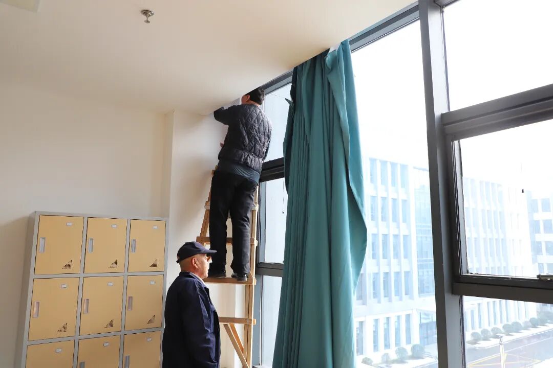 与此同时,校园环境清理与美化工作紧锣密鼓开展。教室内,崭新锁芯安装到位,窗帘维修焕新,净水设备深度清洁消毒,全力保障学子饮水安全;宿舍走廊光洁如镜,楼梯扶手锃亮照人,操场区域整洁有序…… 每一处细节的用心打磨,都是学校对学子最温暖的守护,也为新学期校园生活铺就清新美好的序章。